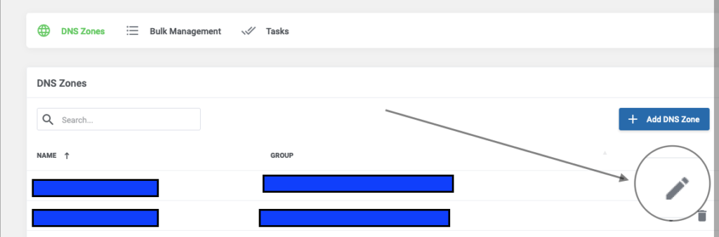 - Navigate to the domain you wish to update (if you have multiple domains) and click “Add Zone” if you have not entered any entries or “Edit Zone” to make changes to your already active DNS zones